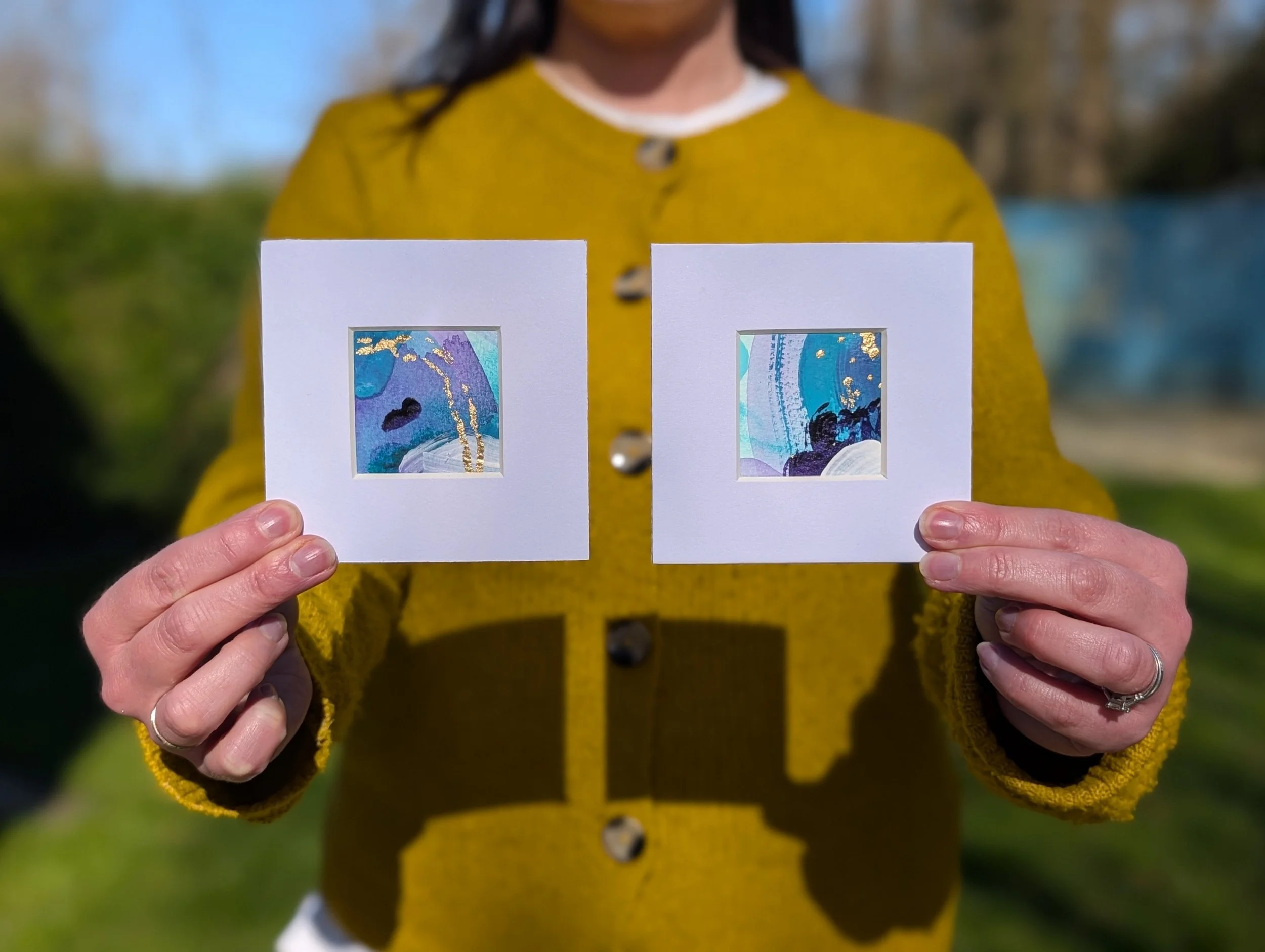 You’ll then find compositions within the larger paintings and cut out to create two mini abstracts which will be mounted to take home.